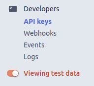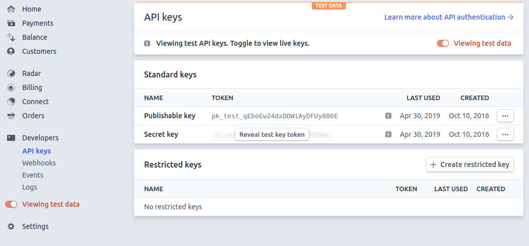 If you would like to do a test payment, copy your test API keys from Stripe. You can do this by toggling the "Viewing test data" switch.